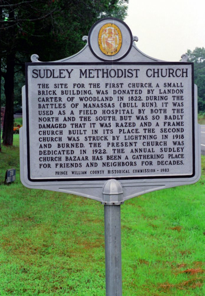 Metal sign marking site of former church that served as field hospital during both battles of Manassas