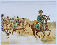 Tarleton's Legion cavalrymen with sabers drawn riding into battle.