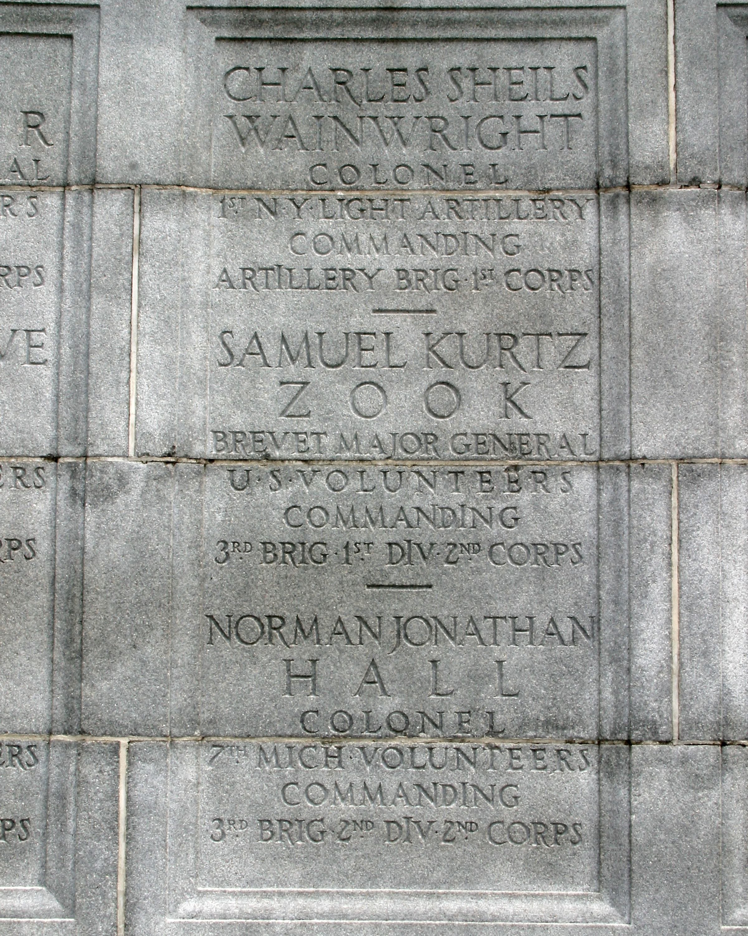1 of 2 New York State Monuments. Erected to commerate NY commanders not listed elsewhere that fought at Gettysburg. Located E side South Hancock Avenue. || Mn, semi-circular 42'L x 24'D x 21' H. Central projecting node of base, shaft incised inscriptions, excised coat-of-arms, topped by spread wing eagle. Incised commander names in circular wall portions. Granite walk to Mn 8'x 14'w/2risers 8."