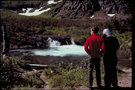 Park visitors observing small waterfall