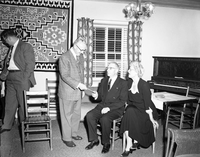 Superintendent Paul R. Franke presenting awards to Ruth Byrd and Carl E. Jepson with members of office staff looking on, headquarters building. ; ZION Museum and Archives Image 9681 ; ZION 9681