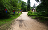Blue and red decorations hanging from trees linking a path to the visitor center