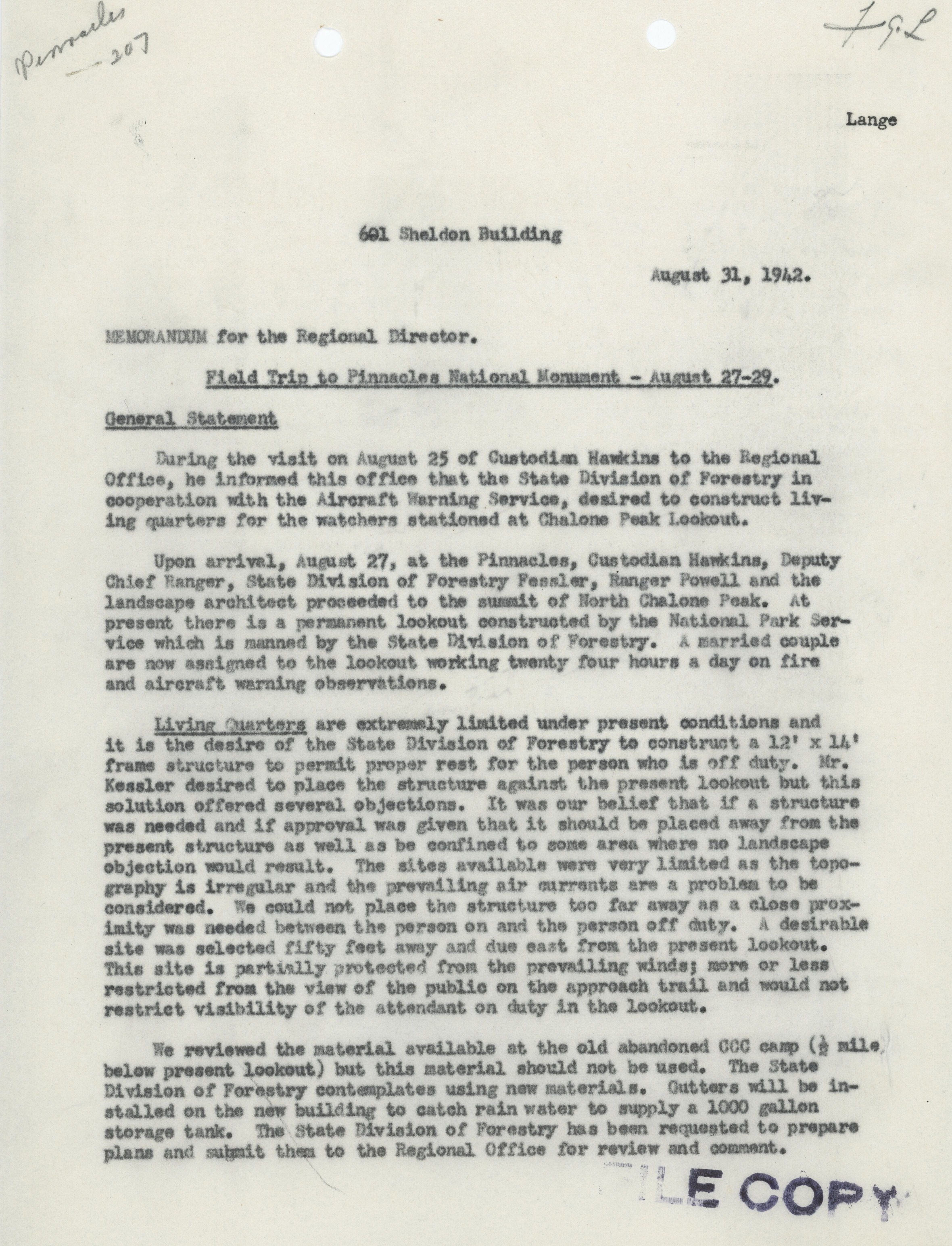 Memorandum for the Director. Report on proposed living quarters at North Chalone Peak.