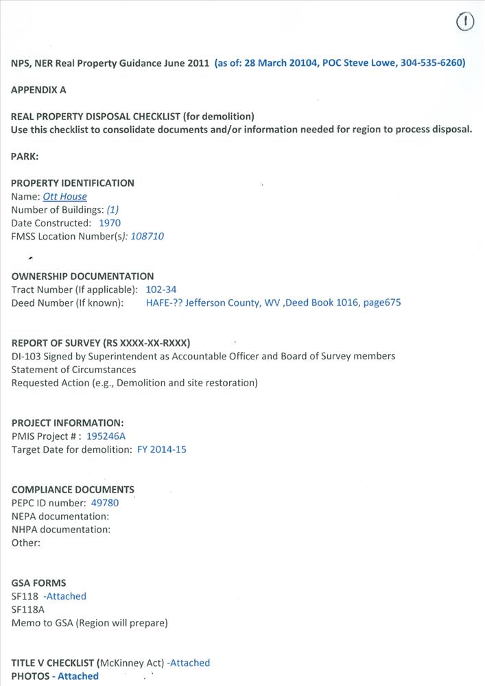 Ott House Documents for Demolition Harpers Ferry National Historical Park March 2014