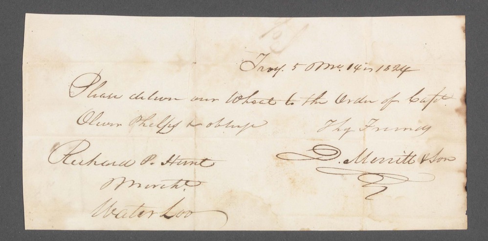 On front of document: “Troy 5 mo 14 1824 Please deliver out Wheat to the Order of Capt Oliver Phelps & oblige Thy Friends D. Merritt & Son Richard P. Hunt Mercht Waterloo” On back of document: "D. Merritt & Son Order for Wheat 5m - 14d 1824"