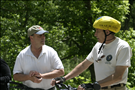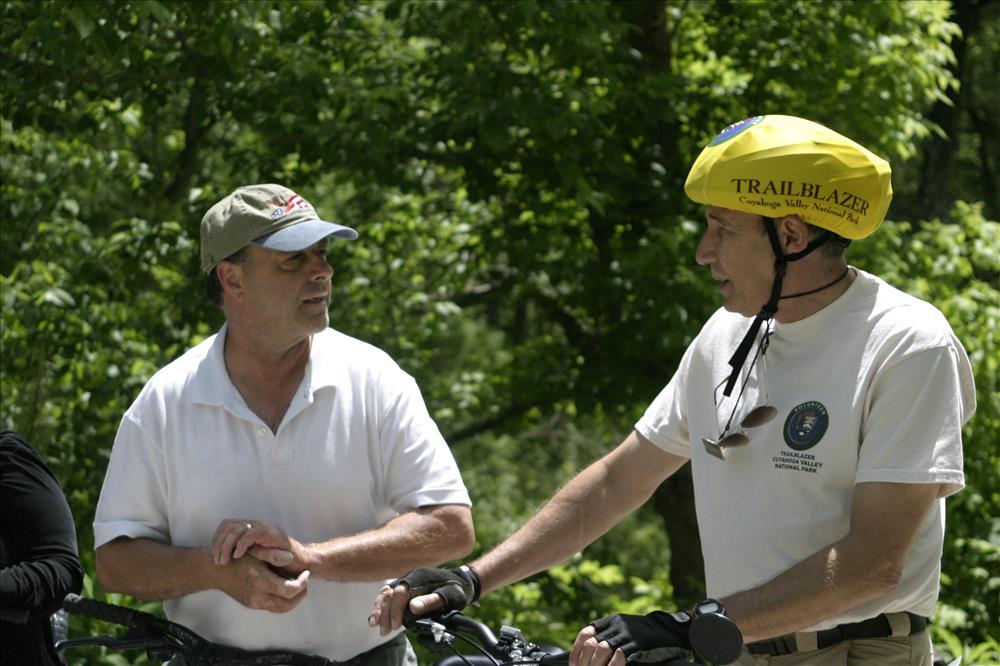 At Cuyahoga Valley National Park volunteers perform a wide variety of duties during every season of the year. Currently over 2,021 volunteers donate over 70,195 hours to the park. || Trailblazer volunteers assist the park by patrolling the Towpath Trail in pairs on bicycle. These volunteers have stopped to talk with visitors.