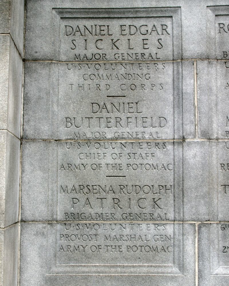 1 of 2 New York State Monuments. Erected to commerate NY commanders not listed elsewhere that fought at Gettysburg. Located E side South Hancock Avenue. || Mn, semi-circular 42'L x 24'D x 21' H. Central projecting node of base, shaft incised inscriptions, excised coat-of-arms, topped by spread wing eagle. Incised commander names in circular wall portions. Granite walk to Mn 8'x 14'w/2risers 8."
