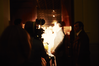 A man speaking with women in square dancing costumes under a spotlight while being filmed.