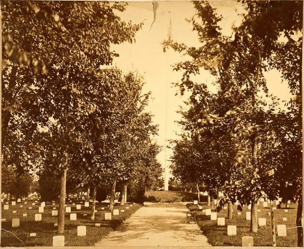 For the design at Yorktown National Cemetery, graves were arranged in a grid of parallel rows divided into four sections by perpendicular avenues. A circular flagstaff mound at the intersection of the two primary walkways near the center of the cemetery was a focal point for visitors entering from the main gate. The trees, turf, and east-west walkway also focused the views through the cemetery.