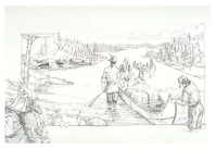 North Men voyageurs setting out from Fort Charlotte for another winter in the Canadian Northwest wilderness via the Pigeon River. The canoes are shown "sunk to the Gunnell."