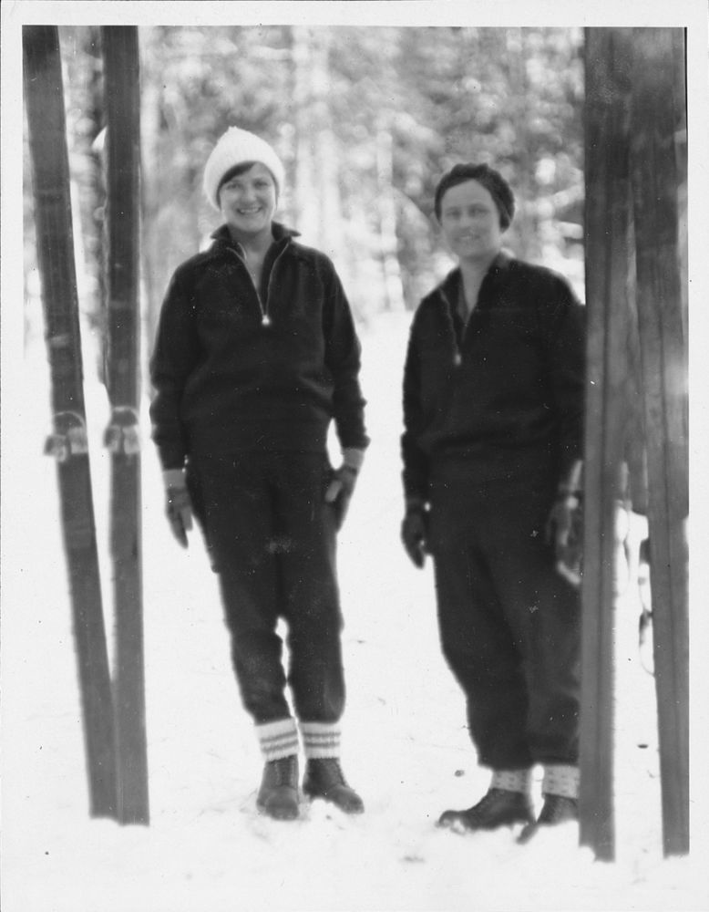 Arthur G. Holmes Collection: Album 3--Group including Mrs. Harold Paige and Mary Adams at start of ski trip to Lassen Peak . Page Note " Mrs Harold Page and Miss Mary Adams-the first women to climb Lassen Peak in mid-winter."