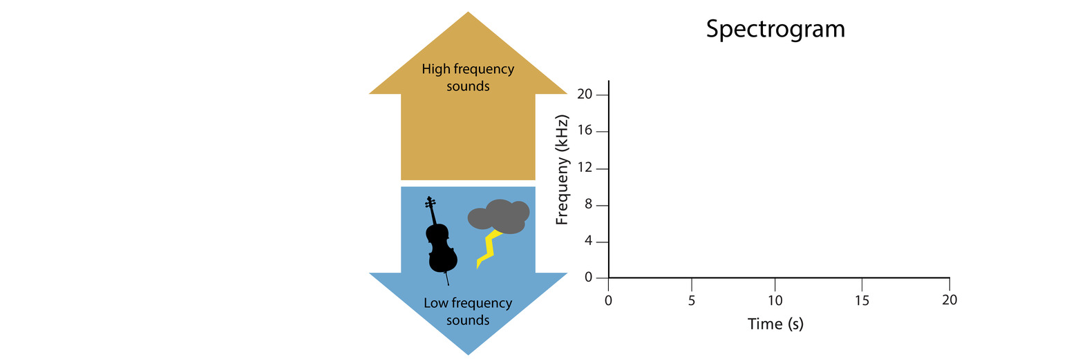 Comparison of two spectrograms that show sounds from acoustic recordings collected at 4AM and sounds at 6AM. Each spectrogram is a graph with an x and y axis. The x axis shows the time in seconds and ranges from 0 seconds to 20 seconds. The y axis shows the frequency of the sound and ranges from 0 Hertz to 20 kilohertz. Frequency is also called pitch. A cello and thunder are examples of low frequency sounds. A whistle and a siren are examples of high frequency sounds. The spectrogram on the left of the screen shows the sounds at 4AM. The only sound recorded at the time is the sound of the highway traffic. The sound occurs during the entire 20 second audio clip and is below 2 kilohertz in frequency. The spectrogram on the right of the screen shows the sounds at 6AM. In this spectrogram, highway noise is present in the entire 20 second audio clip and is below 2 kilohertz in frequency. In addition to highway noise, in the 6AM spectrogram we can see three bird calls that range in frequency from 2 to 14 kilohertz.