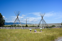 Two tipi structures of poles arranged in a circle and attached at the top in a grassy area beside a set of interpretive markers.