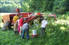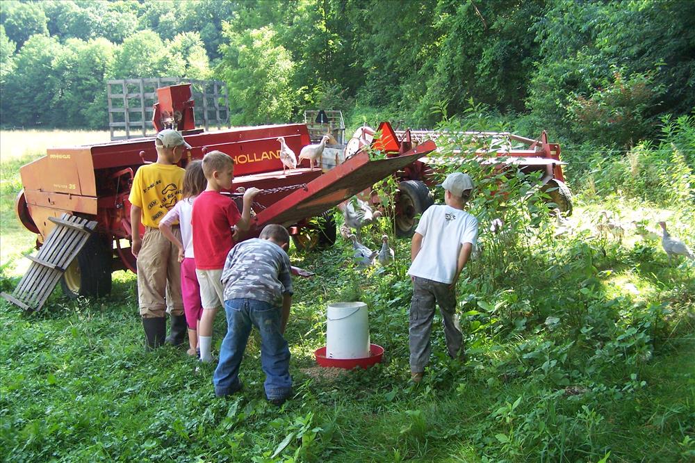 Junior Ranger families observe young turkeys, farm equipment, and the hen house at Goatfeathers Point. They also learn about farm animal care and make a turkey caller. These activities are part of the Goats & Gobblers program for children ages 7-12. The rangers are Margaret Adams and Cindy Porter. The farmer is Terry Smith. || CVNP offers a variety of Junior Ranger programs to families and groups during the summer, and a limited menu to families throughout the year. In 2007 we had a Parks as Classrooms grant to develop pilot programs on working farms on park property. This program, Goats & Gobblers, explores what a farmer does to care for goats and turkeys on his farm.