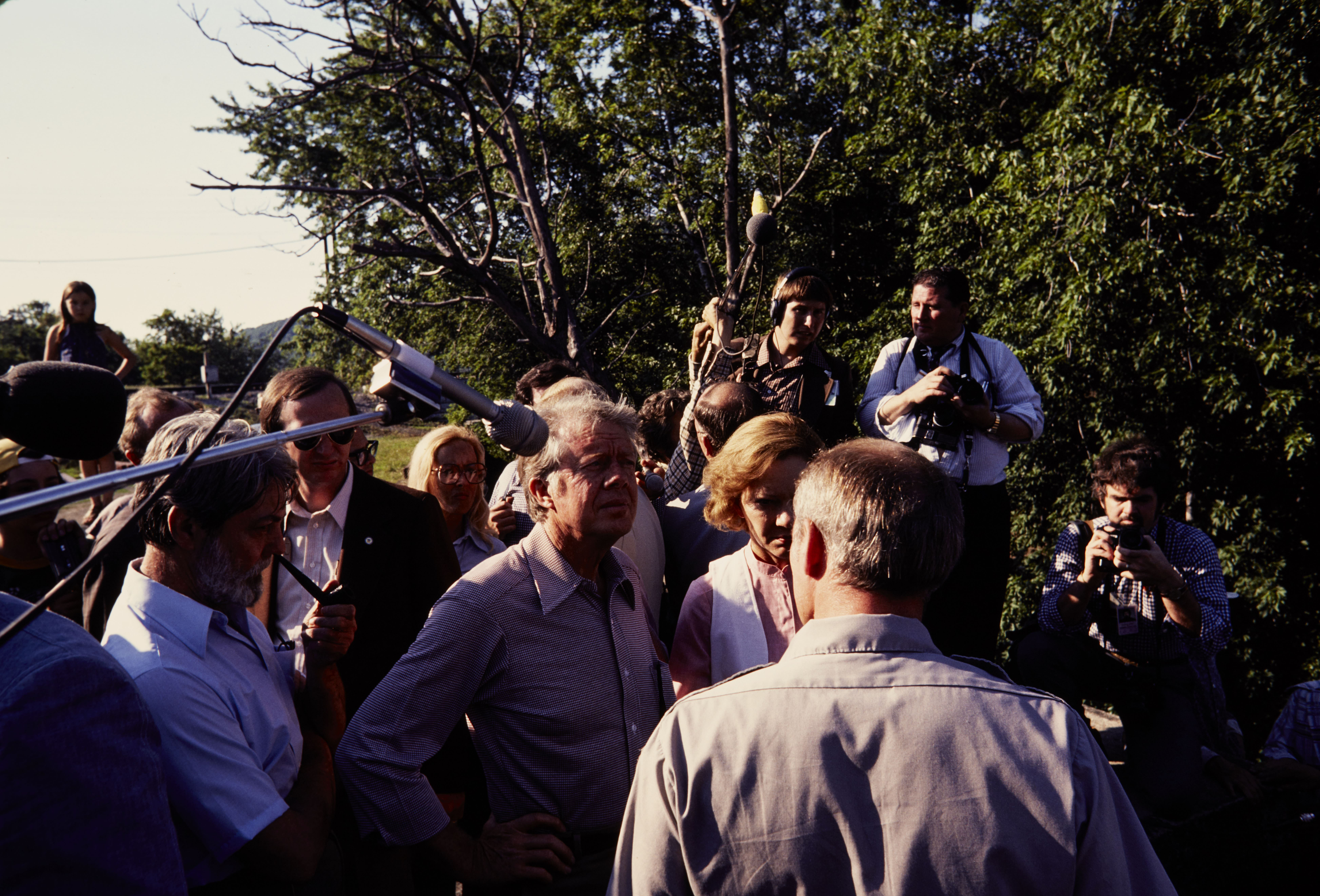 President Jimmy Carter, First Lady Rosalynn Carter, American Historian Shelby Foote, and NPS employee Neal Randell standing with photographers and cameramen in Historic Downtown Harpers Ferry, West Virginia.