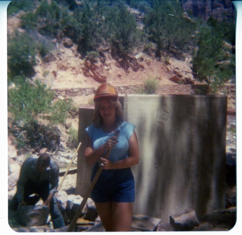 Men building stone abutment for the new Grotto footbridge, woman guiding cement chute for other abutment in foreground. ; ZION Museum and Archives Image 005.06.02-15of53 ; ZION 15933