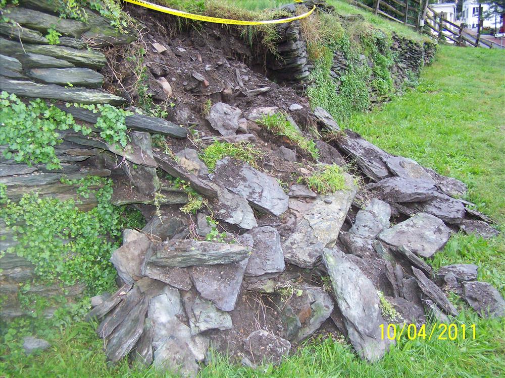 The stone masonry fallout on Saturday, October 1, 2011, at the upper terrace of the historic High Street Retaining Wall (HAFE LCS 03887) in Lower Town, Harpers Ferry, located just above High Street and just below Public Way Street.