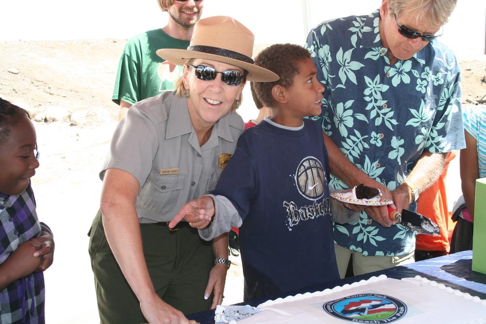 Superintendent Darlene Koontz and John Koeberer, cutting cake with young visitor