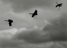 three large birds in flight, their legs dangling straight down as they prepare to land
