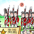 Cartoon drawing of a group of British soldiers in redcoats holding muskets.