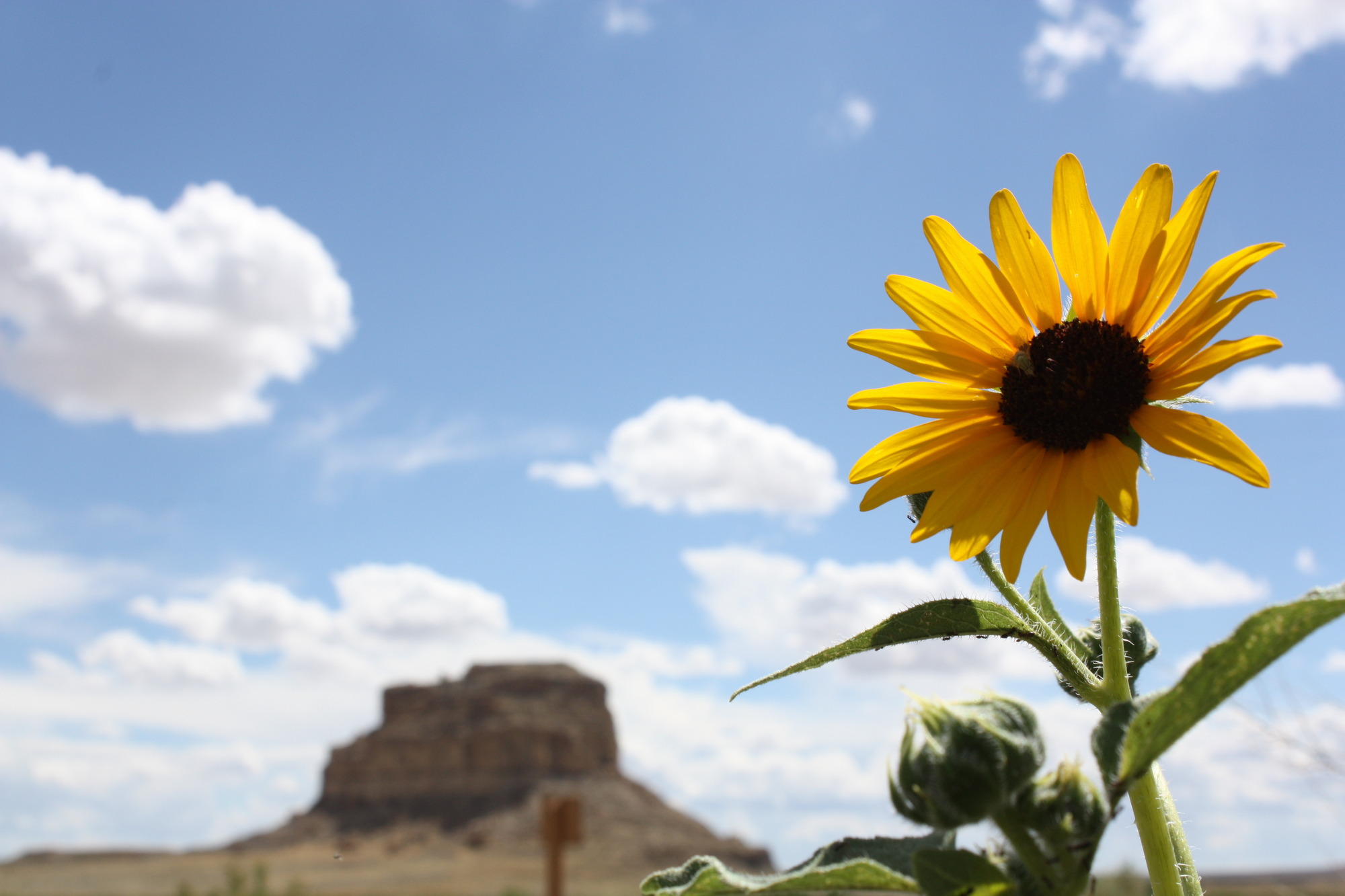 A tall sunflower found near a Chaco road, with Fajada Butte visible in the backgorund in August of 2017.