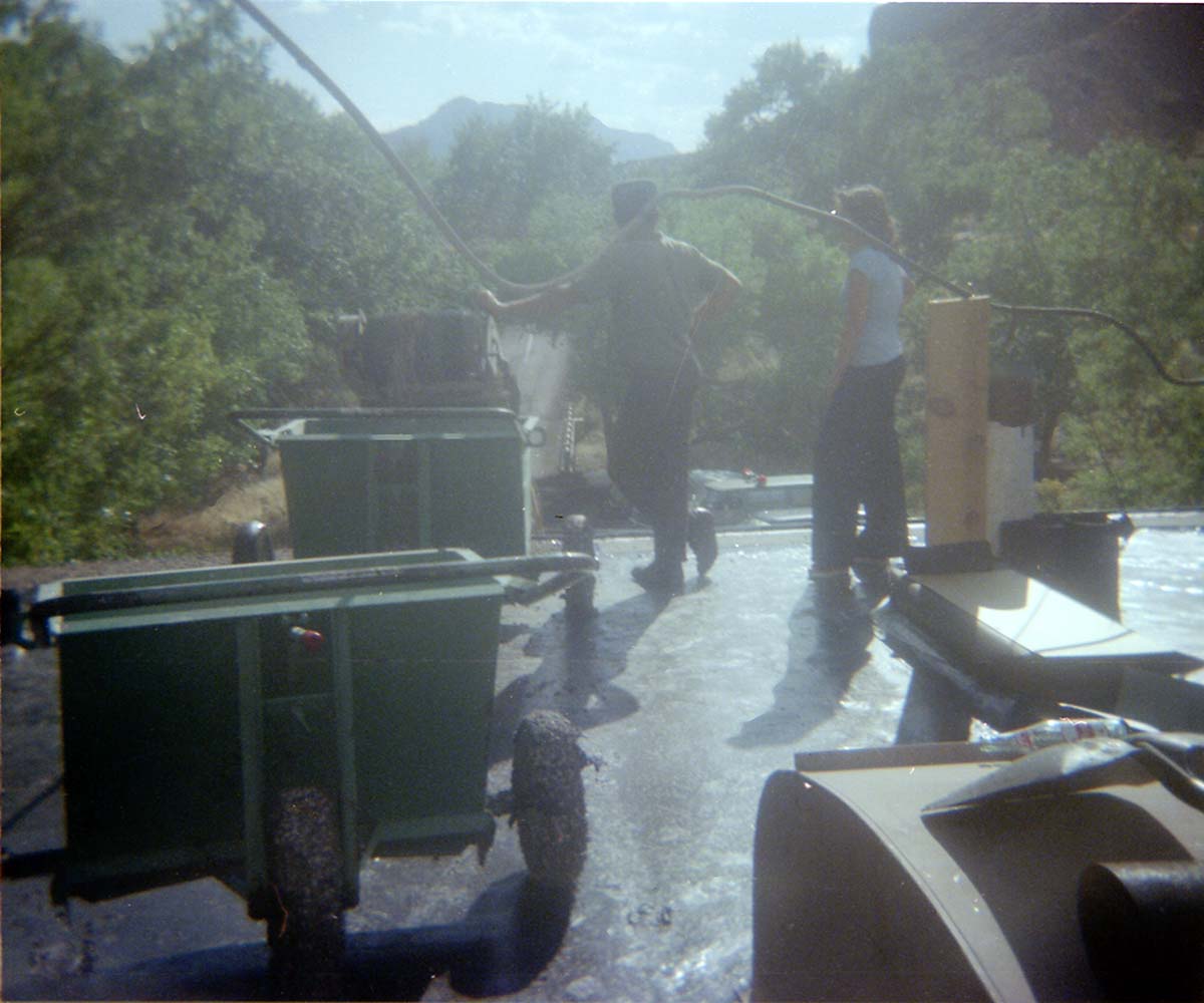 Workers operating roofing machine during the headquarters/visitor center roofing project. ; ZION Museum and Archives Image 004.01.06-4of22 ; ZION 15933
