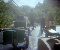 Man standing by as the roofing cart is filled with roofing materials during the headquarters/visitor center roofing project. ; ZION Museum and Archives Image 004.01.06-11of22 ; ZION 15933