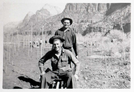 Two Civilian Conservation Corps (CCC) men riding in wheel barrow near the South Entrance. ; ZION Museum and Archives Image 402_05_04003 ; ZION 15933