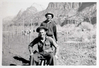 Two Civilian Conservation Corps (CCC) men riding in wheel barrow near the South Entrance. ; ZION Museum and Archives Image 402_05_04001 ; ZION 15933