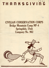 "THANKSGIVING DINNER, 1936, CIVILIAN CONSERVATION CORPS, BRIDGE MTN. CAMP NP-4, CO. 962, SPRINGDALE, UTAH (ZION NATIONAL PARK). TAN COLORED, WITH CARTOON ILLUS. OF PILGRIM WITH TURKEY-FRONT COVER. MENU, NAMES OF ARMY PERSONNEL AND CCC MEN-PRINTED INSIDE.