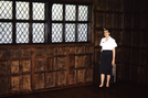 NPS employee in the Elizabethian Room in the visitor center in Fort Raleigh National Historic Site. She wears the 1962 uniform skirt, white blouse, and pillbox hat.