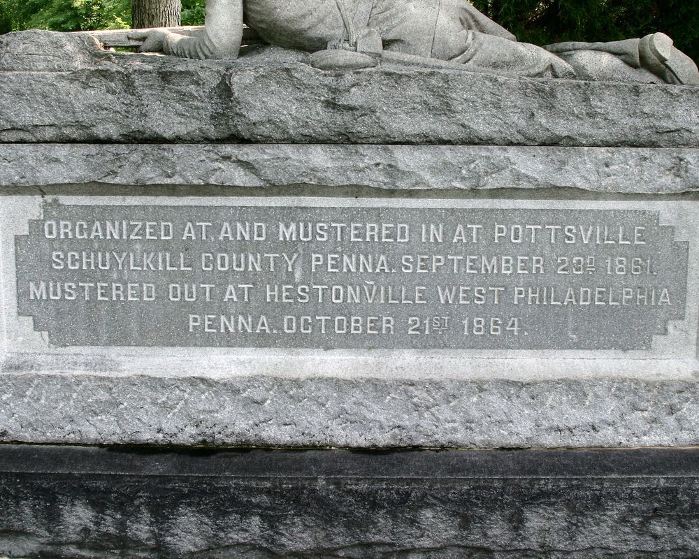 Marks position held by 96th Pennsylvania from July 2 to July 5 1863. 1 of 110 mns in Park to Pennsylvania commands in Gettysburg Campaign. Located N side of Wheatfield Rd E of Althoff Farm Lane. || Mn & 2 flank markers. Triple course rough hewn base, 9'8"x3'7". Rough hewn shaft, 8'9"x2'8", topped w/ sculpture of prone infantryman. Smooth recessed inscription panels on all faces. State seal on W end. Flank markers, 1'x1'x2', left not marked.