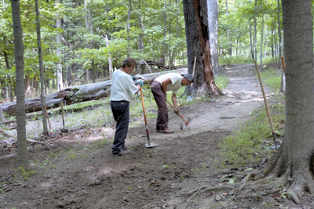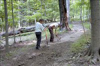 Here volunteers are improving the Stanford Trail by replacing a footbridge and repairing stairs. Images taken in summer at Stanford Trail in Boston, Ohio. || Cuyahoga Valley Trails Council (CVTC) is an all-volunteer, non-profit organization dedicated to improving the trails in Cuyahoga Valley National Park. These park volunteers meet for monthly work sessions from March through December as well as special events.