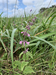 A single flower stem curved to the right with pink flower organized into seven spread out clusters. Each cluster is made up of six flowers whorled around the stem. Each flower is coming out of a hairy purple tube. The pink flowers have an upper petal and lower petal with purple spots. The top clusters are mostly closed buds. Most of the flowers in the lowest cluster have already fallen off, leaving behind their open purple tubes.