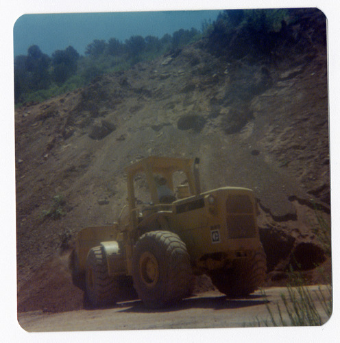 Construction vehicle clearing road for road work in Kolob Canyon. ; ZION Museum and Archives Image 002.08.07-5of36 ; ZION 15933