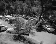 Visitor use - the filled parking area at Temple of Sinawava. ; ZION Museum and Archives Image ZION 7499 ; ZION 7499
