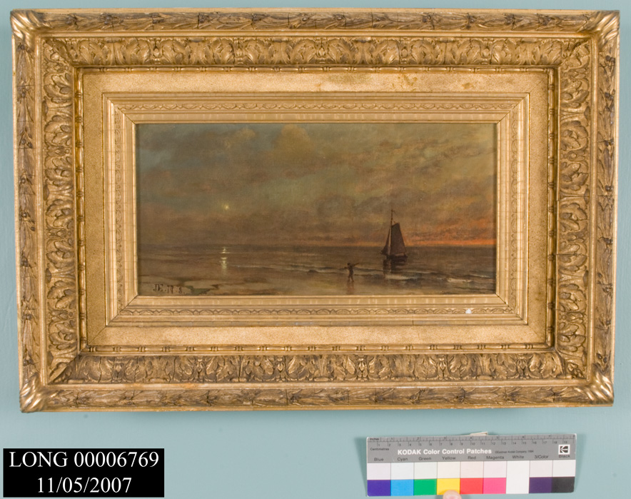 a: OIL ON CANVAS. VIEW OF AN OCEAN SHORE W/ A FIGURE WALKING AT THE WATERS EDGE IN THE FOREGROUND; SAILBOAT AT THE RIGHT. LOW HORIZON LINE W/ RED-TINTED CLOUDED SKY.<CR<CRb: WIDE, OGEE-MOLDED GILT FRAME W/ STYLIZED LEAF DECORATION.'