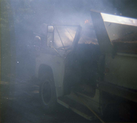 Color photo of an engine fire in a pickup. ; ZION Museum and Archives Image 107_05_01006 ; ZION 15933