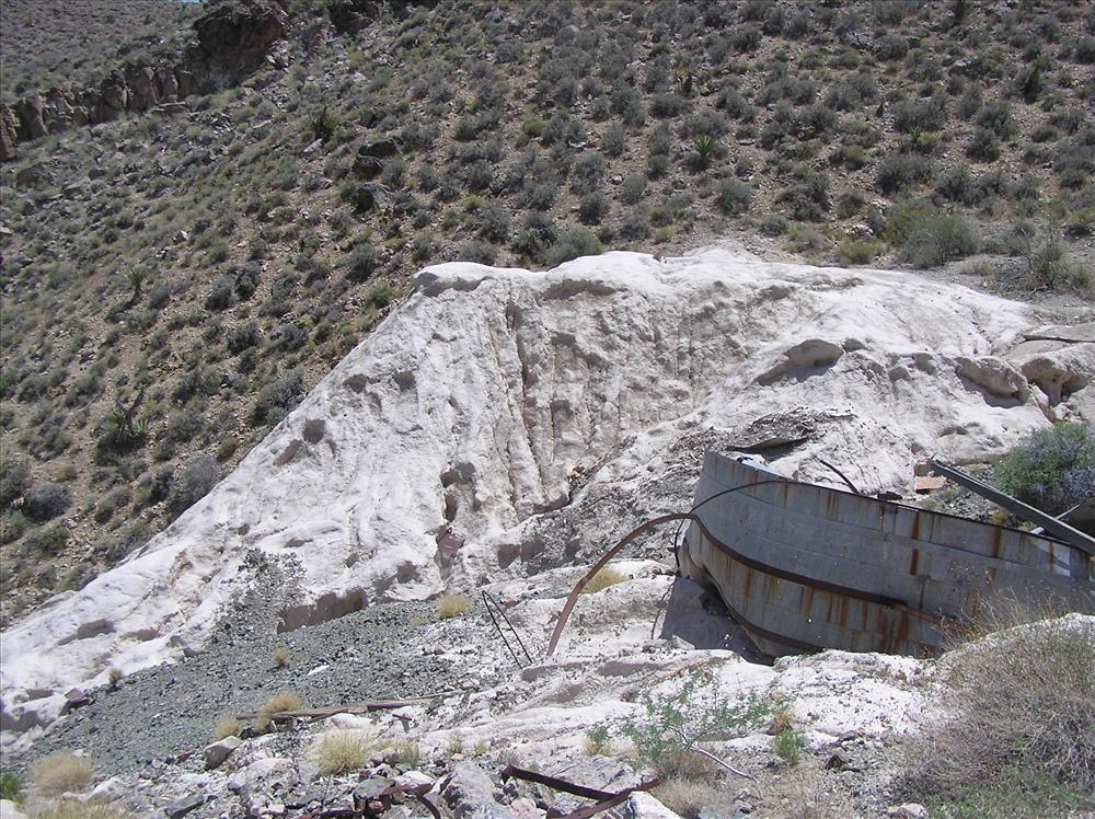Remains of a vat that was used to process gold ore with cyanide at the Bonanza King Mine. The vat is sitting on the edge of a large tailing pile that is at the head of a wash. The pile is approximately 35 to 40 feet tall and the contaminated sediment is moving downstream.