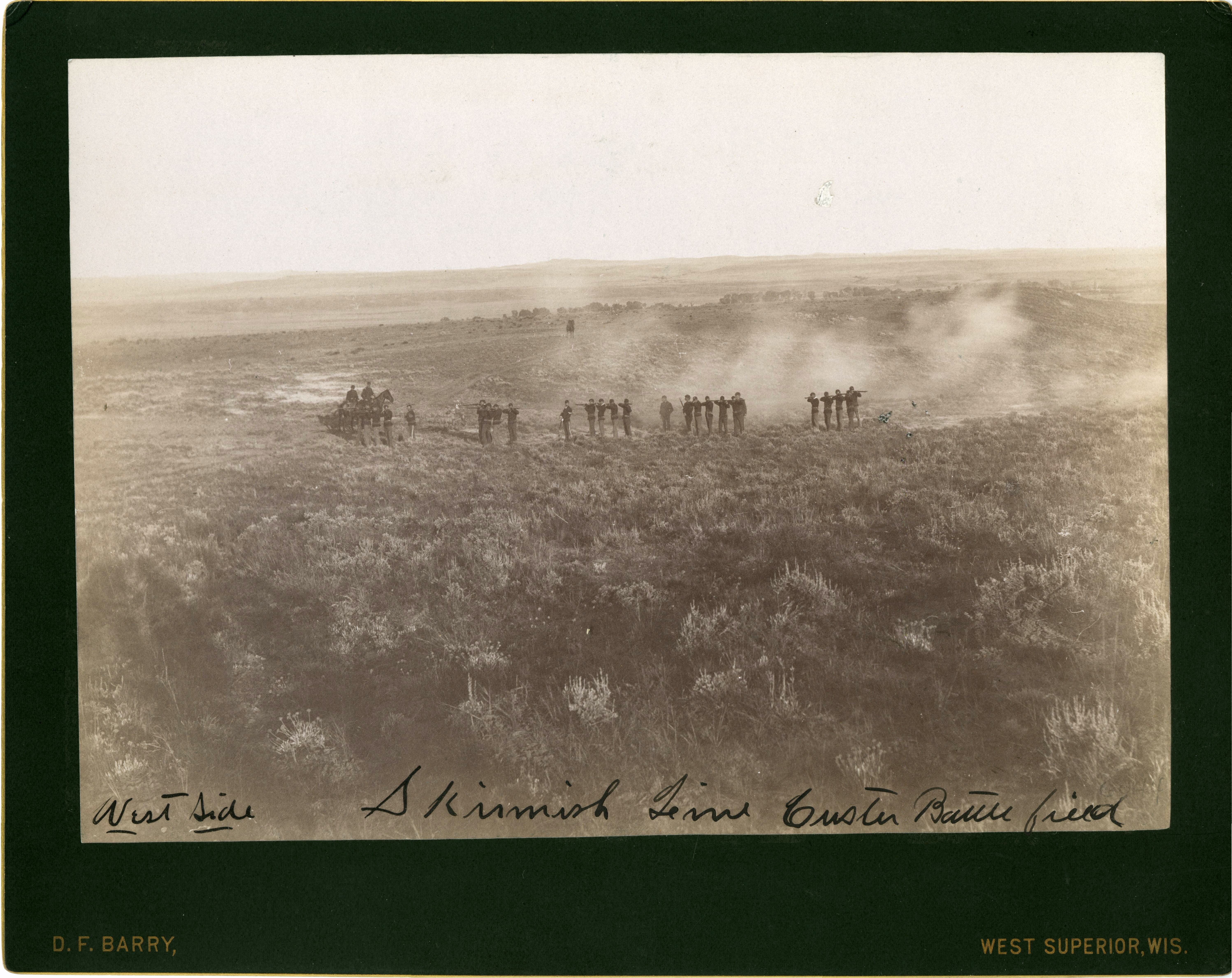 LIBI_00081_06044; Black and white photograph, size: 6 ½” x 8 ¾ mounted on heavy black cardboard with gilded edge. Combined size: 8”x10”. The image shows a skirmish line on the west side of the battlefield. Their weapons are in firing position. Two mounted officers are on the left side of the line. A handwritten note in ink along the bottom of the image reads: “West Side Skirmish Line Custer Battle field.” The photo was taken by D.F. Barry in 1886. Dustin Number 285; picture; Courtesy of the National Park Service, Little Bighorn Battlefield National Monument, LIBI_00081_06044, D. F. Barry, "Skirmish Line on the West Side of the Battlefield," 1886