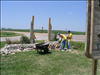 FY06 YCC Ashton Meints, Ryan Root, and Megan Ebke working on old sign base demolition at HOME visitor center, 6/2/2006. This prep work allowed for the installation of a new site sign.