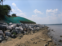 Project included raising the level of riprap around the shoreline of the bluff, constructing an eight foot wide path around the toe of the bluff, constructing a concrete cell wall at the base of the slope, and regarding the top thirty feet of the bluff. The repairs were concentrated along a section of fluff located along the northwest corner of the unit. The repairs generally included raising he height of approximately 650 feet of the existing riprap revetment along the shoreline of the two rivers; removal of vegetation and loose and unstable soil from the toe and face of the bluff; constructing a 450 foot long low height pre-cast concrete retaining wall at the base of the bluff; and then backfilling behind the wall and against the existing slope with an open graded coarse aggregate to control drainage. The top of the wall was built to elevation 16 feet NVGD. A geotextile was used as a filter media to separate the natural soils from the coarse aggregates. The finished slop behind the wall was maintained at a 2 horizontal to 1 vertical slope. An additional 890 tons of riprap was added to the height of the revetment along the project shoreline and thereby provide additional storm protection to the area. The area between the revetment and the retaining was backfilled and a small path was maintained between the toe of the wall and the riprap revetment for public and park access. The finished slope was covered with a geo-cell geo-textile which was filled with topsoil and seeded.