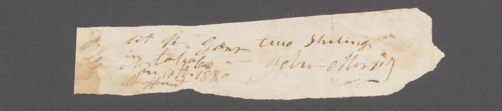 On front of document: "[illegible] two Shilings in tobac Nov 10th 1826 Mr Hunt John Murphy" On back of document: "J.M"