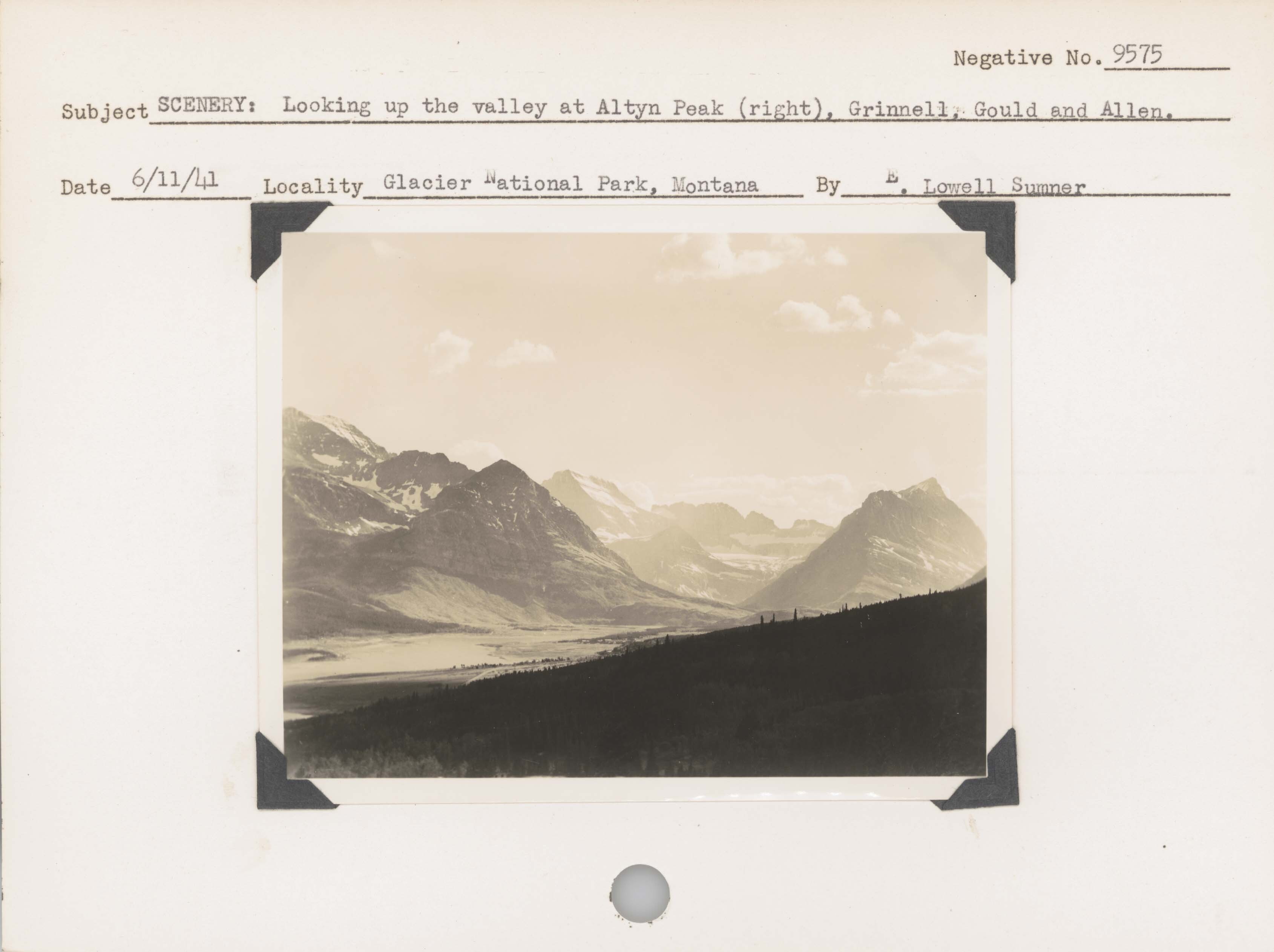 Scenery – Looking up the valley at Altyn Peak (right), Grinnell, Gould and Allen. Negative #: 9575. Locality: Glacier National Park, Montana.