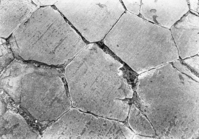View of the glacial polish on the top of the basalt columns at Devils Postpile National Monument. Glaciers have worn and polished the top of the columns making them appear to be a mosaic pattern of tile.