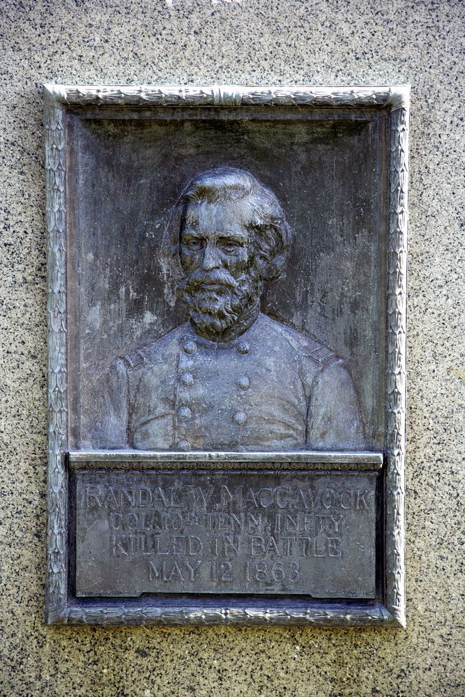 4' x 2' x 6' high, two-piece granite monument with 25" x 39" bronze relief portrait attached to front. Relief panel has inscription and decorative border.