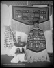Man in ceremonial regalia with Chilkat robes; Killer Whale hat and other objects.