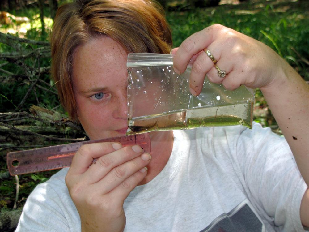 Biologist measures tadpole in Cades Cove, Great Smoky Mountains National Park