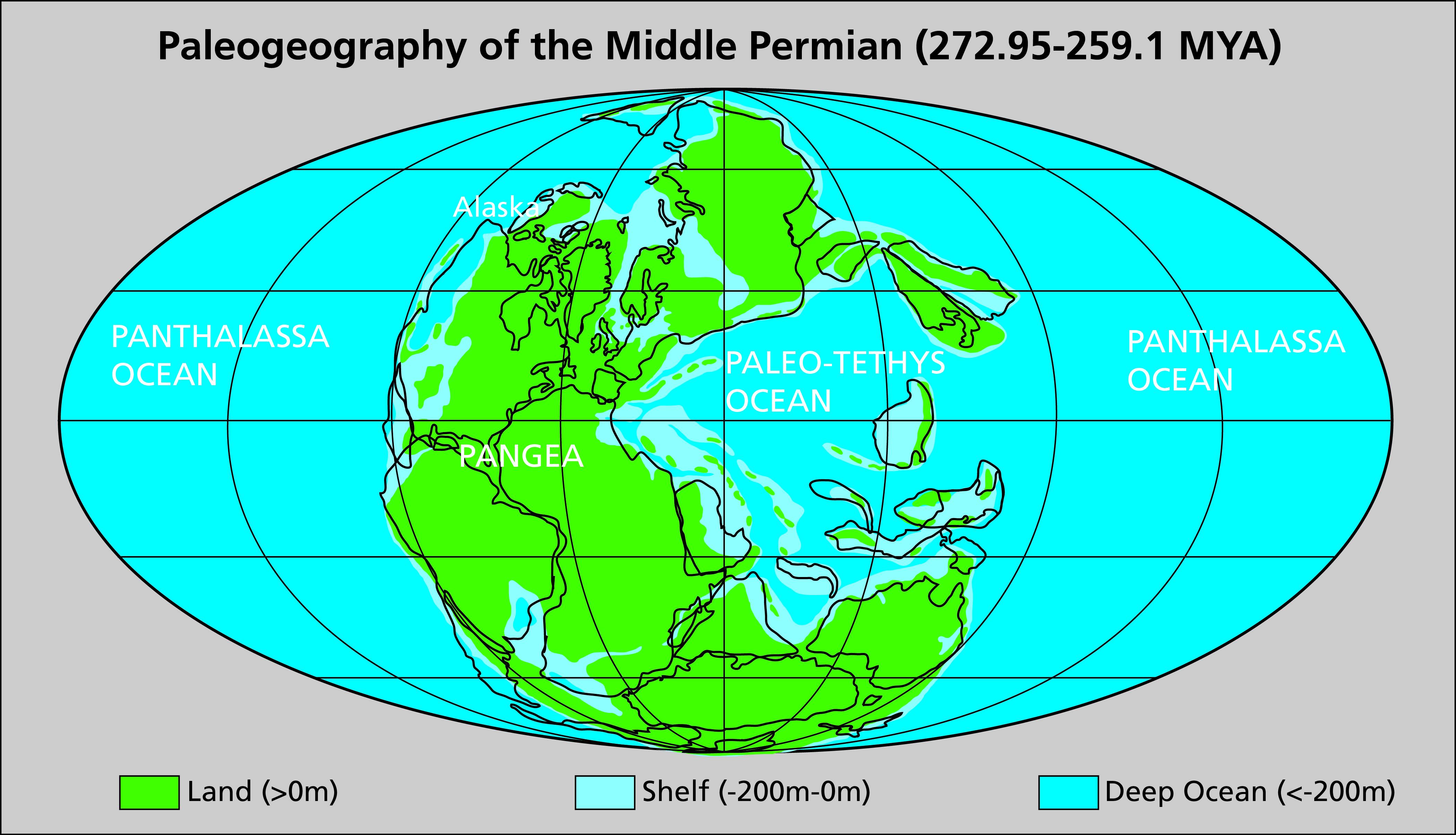Map showing the paleogeography of the Middle Permian (272.95-259.1 MYA). Three settings are mapped: land (>0m elevation), shelf (-200m–0m), and deep ocean (<-200 m). Shelf areas ring the land. On the map the supercontinent Pangaea forms a “C” shaped landmass centered more or less on the equator. The ocean surrounded on three sides by the “C” of Pangaea is the Paleo-Tethys Ocean.