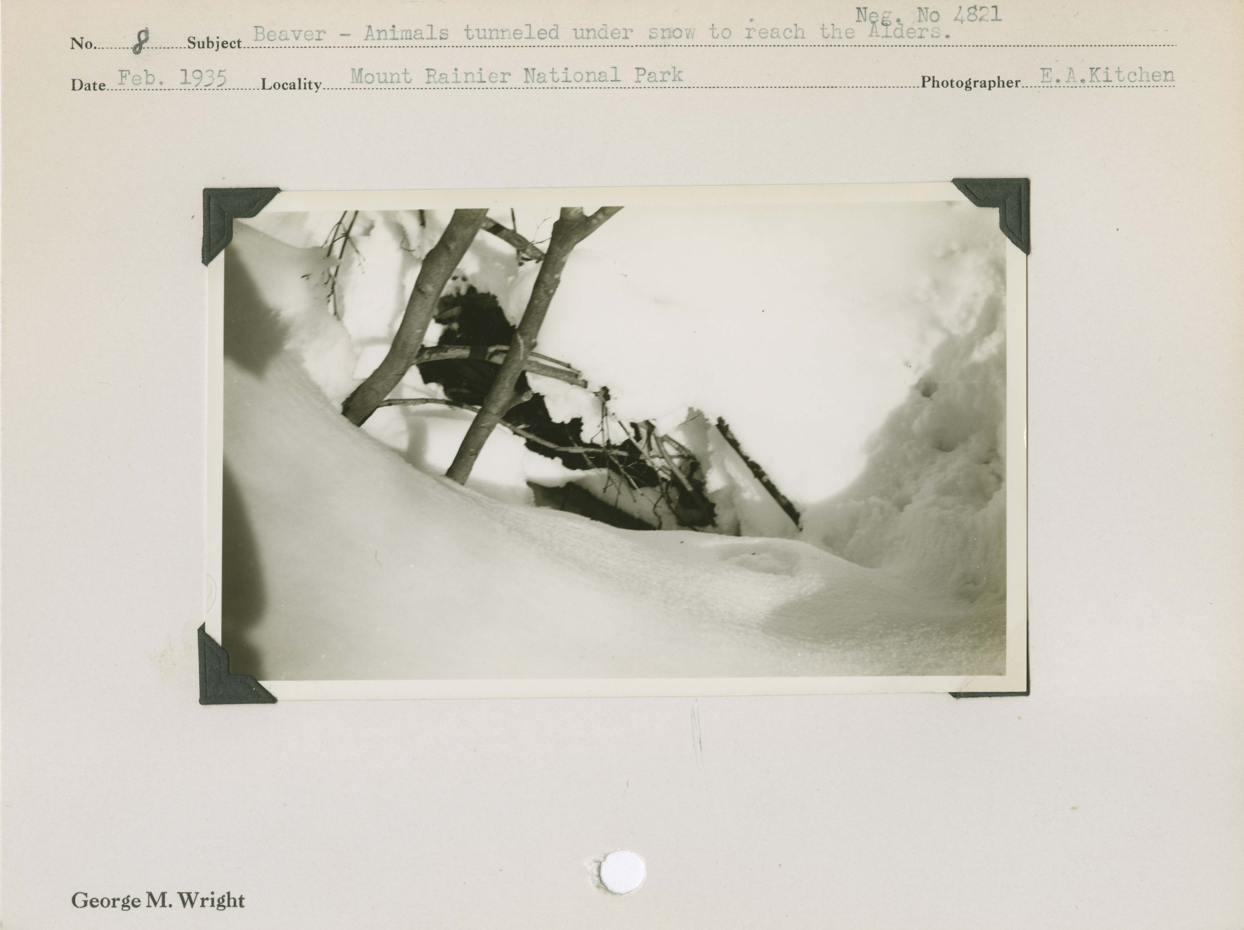 Beaver – Animals tunneled under snow to reach the Alders. Locality: Mount Rainier National Park. Negative #: 4821.
